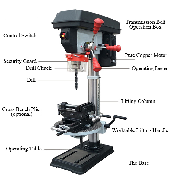 Drill presses: Stationary bench/floor machines (350-750W, 1/4-1HP) for precise perpendicular holes. 5-16 speeds (580-3200 RPM), 13-20mm steel capacity, 50-130mm spindle travel, adjustable table/depth stop. Cast iron base for stability in workshops.